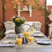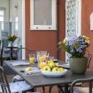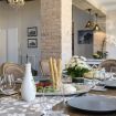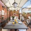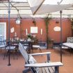 The outdoor area is furnished with tables and sofas and is ideal for dining out or lounging from morning to sunset.